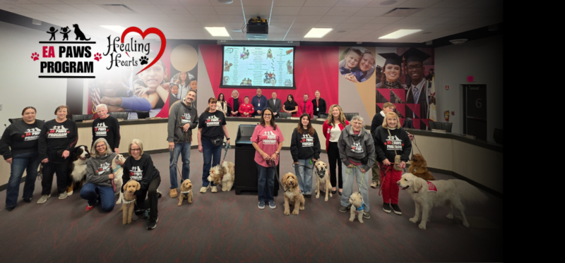 Our partnership with Healing Hearts has been essential to the program’s success. Healing Hearts is a nonprofit organization dedicated to training and certifying comfort dogs and their handlers to serve schools, hospitals, first responders, and community organizations. Their rigorous training program ensures that each dog is temperament-tested, professionally trained, and paired with a dedicated staff handler. Beyond initial training, Healing Hearts provides ongoing guidance, certification standards, and continued professional development to ensure that each EA PAWS team maintains the highest level of safety, structure, and effectiveness.